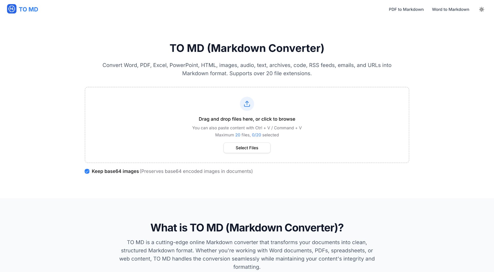 Convert Word, PDF, Excel, PowerPoint, web pages, images, audio, archives, code files, RSS and URLs into Markdown in seconds. No signup required, free forever, private by design.